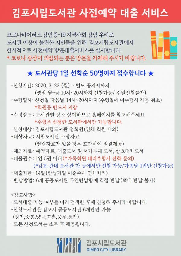 김포시가 코로나19 예방과 도서관 이용시민 불편 해소를 위한 사전예약 자료대출 서비스를 오는 23일부터 시작한다.
