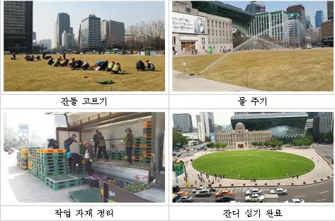 이번에 서울광장 잔디식재를 위해 준비한 잔디는 약 6,449㎡ 규모로서 폐잔디를 반출하고 지반을 정리한 후 이틀간 잔디를 심어 시민들에게 봄소식을 대대적으로 알리고자 한다.