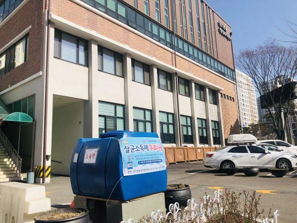 장기본동행정복지센터는 지난 19일부터 행정복지센터 청사 주차장에 살균소독제 탱크를 설치해 소독제를 무료로 나눠주고 있다.