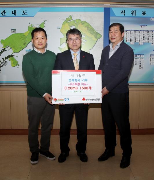 ㈜티월드는 지난 20일 인천 중구을 방문해 중구 관내 어려운 이웃들을 위해 써달라며 ‘손세정제’1,500개를 기탁했다.
