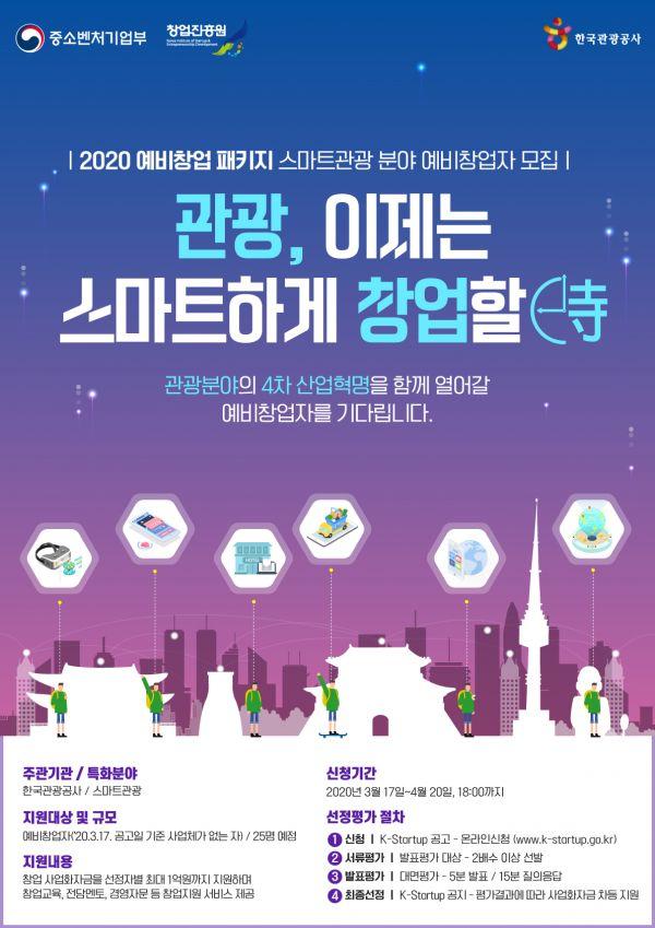 한국관광공사는 중소벤처기업부가 추진하는 ‘2020 예비창업패키지 지원 사업’에 주관기관으로 참여, 지난 17일부터 시작해 오는 4월 20일까지 스마트관광 분야 창업에 도전할 예비창업자를 모집 중이다.