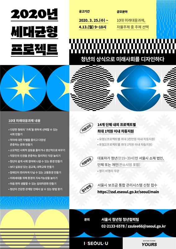 서울시는 청년 스스로 청년세대의 사회적 요구에 대응하는 2020년 세대균형 프로젝트 ‘청년의 상식으로 미래사회를 디자인하다’의 참여자를 모집한다.