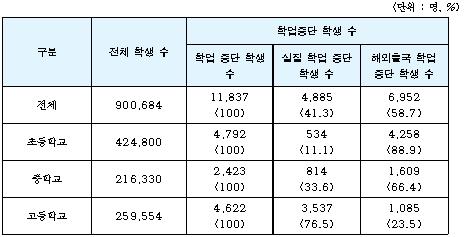 이중에는 질병이나 교내 폭력, 부적응 등의 이유로 학업을 중단하는 경우가 약 38.5%에 달한다.