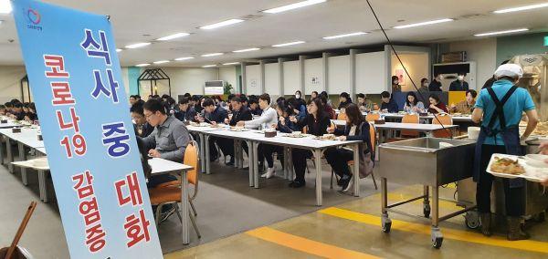 구내식당 좌석은 총 360석, 양 옆으로만 앉게 되는 관계로 직원들을 3개조로 분산, 조별 30분 단위로 식당을 이용해야 한다.