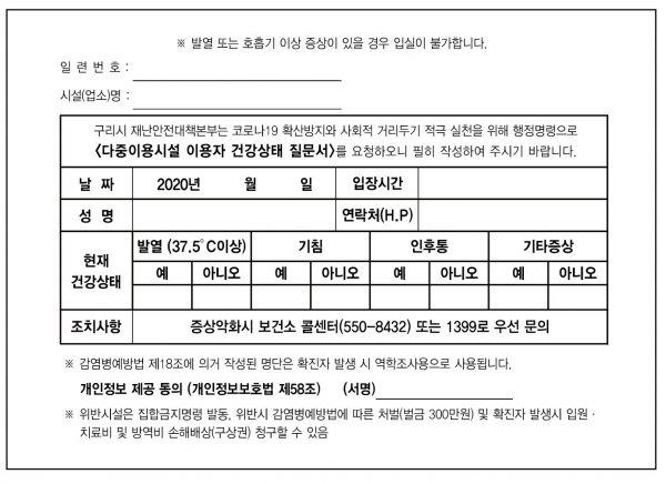 결국 구리시는 중앙정부, 경기도와 또 다른 방향에서 다중이용시설을 이용하는 많은 분들의 건강상태를 직접 일일이 한 명씩 체크하는 질문서를 구리시 재난안전대책본부장 명의로 행정명령을 내려서 관내 1만 1,726개소에 대해 이틀 뒤부터 실시할 예정이다을 알렸다.