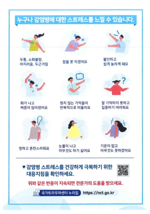 최애경 보건소장은“감염병 유행 시에는 누구나 불안과 스트레스를 느낄 수 있고 이러한 반응은 자연스럽고 정상적이므로 두려워하거나 감출 필요가 없고. 대부분 증상들은 시간이 지날수록 점차 감소하지만 그럼에도 불구하고 심한 스트레스가 지속된다면 혼자 어려움을 겪지 말고 구리시정신건강복지센터로 연락해 심리 상담을 받으시길 당부드린다”고 전했다.