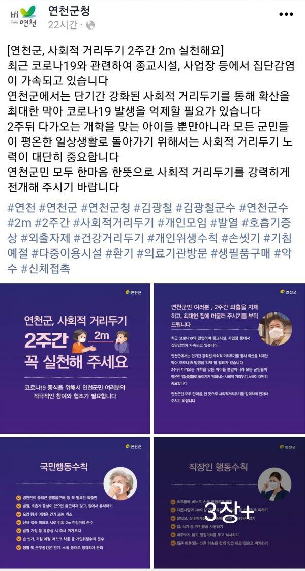 또한 연천군 공식 SNS, 전광판, 군정소식 문자서비스 등을 통해 실시간으로 연천군 일일현황, 사회적 거리두기 캠페인, 연천군 사칙연산 캠페인 등 코로나 관련 뉴스 및 소식을 신속하고 정확하게 알리고 있다.