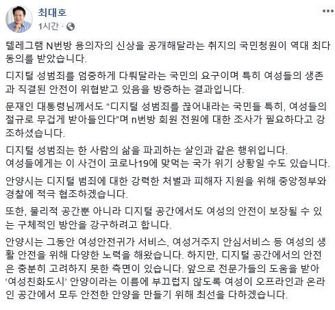 최대호 안양시장이 24일 자신의 sns를 통해 최근 파장이 심해지고 있는 텔레그램 n번방 사건에 대해 소신 발언을 했다.