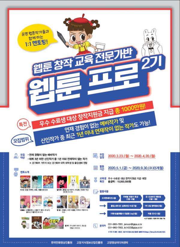고양지식정보산업진흥원은 ‘경기북부 웹툰창작체험관 조성 및 운영’ 사업의 웹툰 작가 양성 프로그램인 ‘웹툰 프로 2기’ 교육생을 오는 4월 20일까지 모집한다.