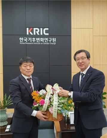 최승봉 강원도보건환경연구원장이 24일 코로나19로 어려움을 겪는 화훼농가를 돕기 위해 플라워 버킷챌린지에 동참, 김상현 한국기후변화연구원장에게 꽃바구니를 전달했다.
