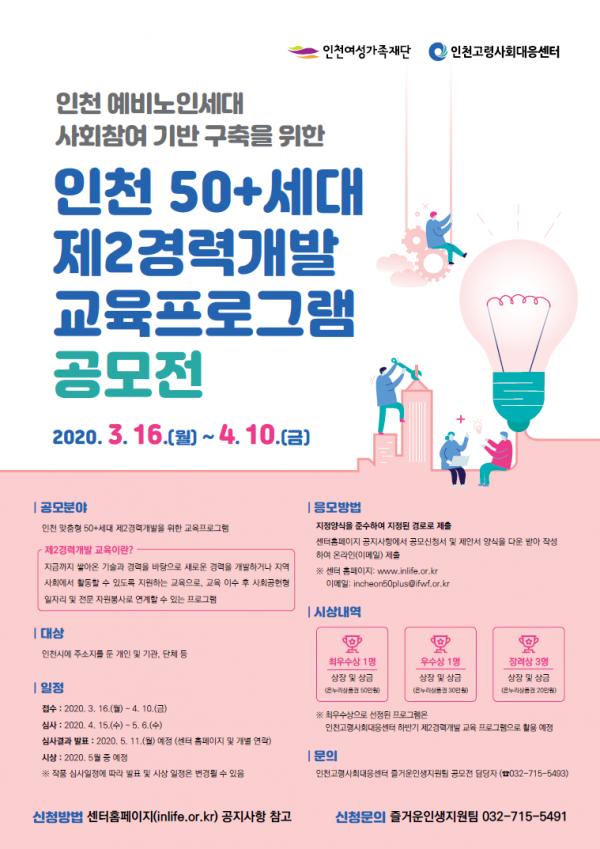 이번 공모는 “인천시 50+세대 맞춤형 제2의 경력개발을 위한 교육프로그램”을 주제로 진행되어 예비노인세대의 특색 있고 다양한 욕구를 반영한 우수 프로그램 발굴할 예정이다.
