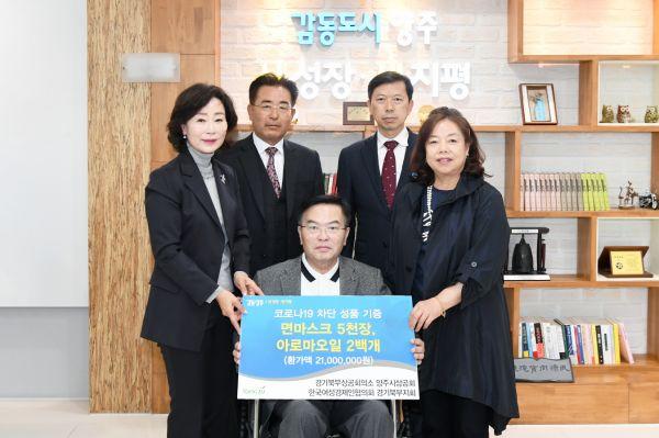 양주시는 지난 24일 경기북부상공회의소 양주시상공회와 한국여성경제인협의회 경기북부지회에서 시청을 방문해 면마스크 5,000장과 아로마오일 200개를 전달했다고 밝혔다.