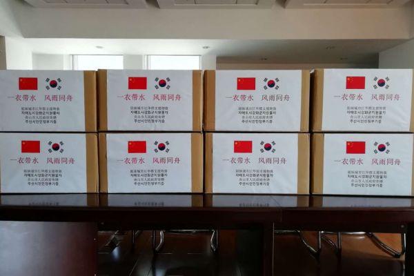 중국 주산시는 '一衣?水 ?雨同舟"는 응원 메시지와 함께 일반용 마스크 2만 개를 보내왔다.