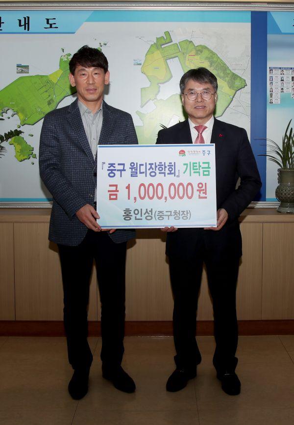 홍인성 인천 중구청장은 지난 2월 23일 연합매일 신문사가 주최한 제21회 대한민국 인물대상 시상식에서 ‘정치-지자체’부문 수상자로 선정되어 받은 상금 50만원과 개인사비 50만원을 더해 중구 월디장학회에 장학금으로 100만원을 기탁했다.