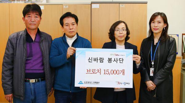 신바람 봉사단 김봉호 단장은 24일 브로치 1만5천 개를 미추홀구에 전달했다.