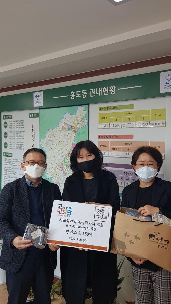 고양시 덕양구 흥도동행정복지센터에서는 코로나19의 장기화로 전국적인 마스크 품귀 현상이 이어짐에 따라 마스크 구입에 어려움을 겪고 있는 취약계층을 위해 지난 24일 사회적 기업 ㈜감쪽가치로부터 세탁이 가능한 면 마스크 150개를 기부받았다고 밝혔다.