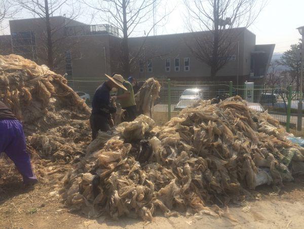 송탄동 13통 하리마을 및 주민은 개인의 농경지에서 발생한 폐비닐을 관내 마을별로 순회해 수집했으며 폐비닐에 붙어있는 이물질 등을 제거했다.