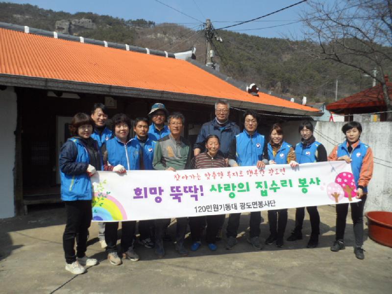 [미디어 타임즈 = 최귀복 기자] 통영시 광도면 120민원기동대(대장 유용준)는 지난 12일, 소외계층 세대를 방문해 사랑의 집수리 봉사활동을 실시했다. 이 날은 광도면 120민원기동대 봉사자와 광도면 행정복지센터 맞춤형 복지팀 직원 등 11명이 고령에 관절질환이 심해 거동이 불편한 어르신 댁을 방문해 쾌적하고 안전한 주거 환경개선을 위해 구슬땀을 흘렸다. 이번 집수리는 낡고 부서진 싱크대를 새 것으로 바꾸고 오래된 벽지를 새 벽지로 도배하였으며, 화장실 지붕이 노후 되어 비가 새고 화장실 문짝이 없어 생활에 큰 불편을 겪고 있어 화장실 지붕과 문짝을 교체 했다. 유용준 대장은 "앞으로도 우리 이웃의 도움이 필요한 곳이 있으면 언제든지 달려가 봉사하겠다"고 말했다. 김호석 광도면장은 "120민원기동대 대원들의 봉사로 우리 이웃에게 큰 힘이 됐다"며 "맞춤형 복지로 행복한 광도면을 만들어 나가는데 적극 동참해 주길 바란다"고 전했다. 한편, 광도면 120민원기동대는 주거환경이 열악한 세대를 방문해 집수리 등 문제를 해결해 주는 ‘희망! 뚝딱이 집수리 사업’을 전개해 찾아가는 맞춤형 복지를 실현해 나갈 계획이다.