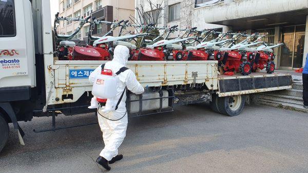 군은 신규 구입한 농기계를 각 면에 배치 전 코로나19 예방을 위해 운전자 체온체크 및 화물차량과 농기계에 대한 사전 방역을 실시했다.