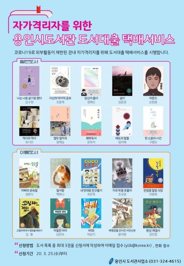 용인시는 코로나19로 외부활동이 제한된 자가격리자들을 위해 택배로 1인당 3권씩의 책을 보내준다고 25일 밝혔다.