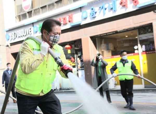 살수차량을 활용한 바닥청소가 중심을 이루는 가운데 인근 상인들까지 거들고 뒤 이어 방역소독이 이뤄지는 등 코로나19를 예방하려는 민관의 의지가 돋보였다.