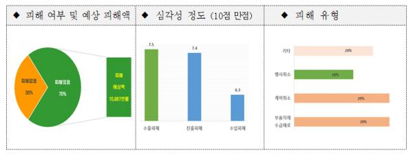 조사 결과, 응답기업의 70%가 ‘피해가 있다’고 답했고 느끼는 피해 심각도는 ‘수입’보다 ‘수출’이 컸다.