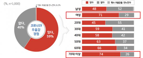 우울감을 느끼게 되는 요인으로는 외출 자제로 인한 갑갑함, 감염에 대한 막연한 불안, 소득·지출 감소에 따른 스트레스 등이 높게 제시됐다.
