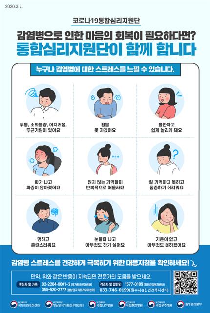 원주시 관계자는 코로나19로 인한 스트레스가 지속된다면 혼자 어려워하지 말고 심리 상담을 받아 달라며 시민들이 감염병 스트레스에 건강하게 대처할 수 있도록 적극 지원하겠다고 말했다.
