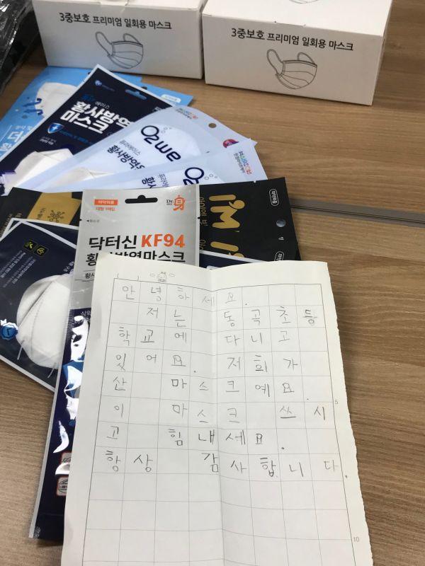 엄마 손을 잡고 파출소를 방문한 한 초등학생은 “안녕하세요. 저는 동곡초등학교에 다니고 있어요. 저희가 산 마스크예요. 이 마스크 쓰시고 힘내세요. 항상 감사한다”며 직접 쓴 편지와 그동안 모은 일회용 마스크 10매를 기부했다.