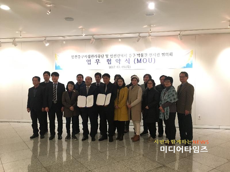 [미디어타임즈=문상수 기자] 인천중구시설관리공단(이사장 박천호)과 인천중구박물관·전시관협의회(회장 정성길)는 지난 9일 중구 문화예술 발전을 위하여 한중문화관에서 업무협약을 체결했다.중구시설관리공단 문화사업팀은 한중문화관 등 5개 박물관·전시관을 운영 중에 있으며 또한 인천중구 박물관·전시관 협의회는 중구 관내 12개 사립박물관이 회원관으로 있는 협의체로 추후 회원관을 늘려나갈 계획이다.박천호 이사장과 정성길 협의회장은 “인천중구 내 각 박물관‧전시관이 서로 상생하여 문화예술 관광산업의 메카로 자리잡을 수 있도록 적극 노력하겠다”고 밝혔다.이번 협약은 공·사립 박물관·전시관간 발전을 도모하기 위한 것으로, 협약체결 이후 중구 관내 박물관 미술관의 홍보와 전시교류 및 중구의 문화예술 발전을 위한 연구 등을 함께 진행해 갈 예정이다.