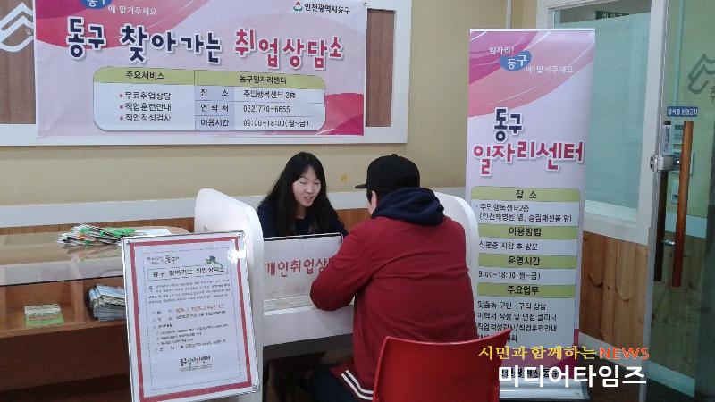 [미디어타임즈=문상수 기자] 인천 동구(구청장 이흥수)는 14일 동구 화도진도서관 2층 취업까페에서 맞춤형 취업지원을 위한 ‘찾아가는 취업상담소’를 운영했다.구에 따르면 시간·거리상의 불편과 정보부족 등의 이유로 동구 일자리센터(주민행복센터 2층)를 이용하지 못하는 주민들이 편리하게 고용서비스를 접하고 취업에 성공할 수 있도록 오는 11월까지 매월 유동인구가 많은 장소에서 ‘찾아가는 취업상담소’를 운영할 예정이다.이날‘찾아가는 취업상담소’에는 동구 일자리센터의 전문직업상담사가 배치돼 직업상담 및 취업알선 제공뿐만 아니라 직업심리검사, 내일배움카드제 등 무료 직업훈련 안내, 2017년도 채용박람회 및 취업특강 일정 등 취업을 위한 유익한 정보도 함께 제공했다.한편 구는 작년 한해 7차례 취업상담소를 운영해 199명의 구직자를 상담했으며 이들 중 76명이 맞춤형 상담을 거쳐 취업에 성공했다고 밝혔다.또한 취업에 어려움을 겪고 있는 구직자를 위한 취업특강(이력서 작성법, 면접법)을 운영하고 다문화가정을 위한 방문상담도 계획하는 등 취업 취약계층을 위한 다양하고 능동적인 지원을 이어갈 계획이다.구 관계자는 “일자리야말로 주민에게 제공할 수 있는 최고의 복지서비스”라며 “동구 일자리센터가 주민들의 진로탐색과 자아실현을 돕는 든든한 안내자 역할을 할 수 있도록 언제나 최선을 다 하겠다”고 말했다.