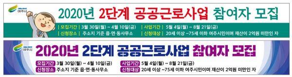 여주시는 저소득 취약계층과 미취업 청·장년층을 대상으로 2020년도 제2단계 공공근로사업 참여자 56명을 오는 30일부터 4월10일까지 모집한다고 밝혔다.