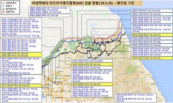 환경부 소속 국립환경과학원은 3월 23일~24일 강원도 화천군 화천읍 및 상서면, 경기도 연천군 연천읍, 왕징면 및 중면, 파주시 장단면에서 발견된 멧돼지 폐사체 9개체에서 아프리카돼지열병 바이러스가 검출됐다고 3월 25일 밝혔다.