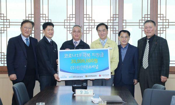 평택시에 위치한 ㈜원인터내셔널은 지난 25일 시청 대외협력실에서 코로나19 성금 3천만원을 전달했다.