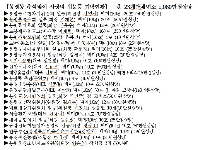 한가위를 맞아 봉평동 독지가 및 자생단체에서는 관내 복지사각지대와 어려운 이웃과 더불어 따뜻한 명절을 나누고자 백미, 과일, 라면, 상품권 등 사랑의 위문품을 봉평동 주민센터(동장 추영석)에 기탁하여 이웃사랑 나눔 실천에 앞장서고 있다.