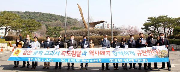 경기도의회 독도사랑·국토사랑회가 지난 25일 경기도의회 평화의 소녀상 앞에서 일본 중학 교과서 독도침탈과 역사왜곡 규탄 성명을 발표했다.