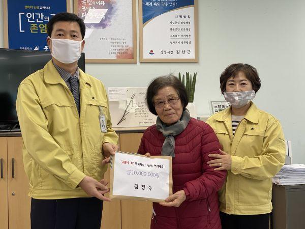 강릉시 중앙동에 단독노인가구로 생활하시는 김정숙 어르신은 26일 오전 11시, 강릉시청을 방문해 코로나19 사태로 인해 어려움을 겪고 있는 강릉시민을 위해 써달라며 일천만원을 사회복지공동모금회에 기탁했다.