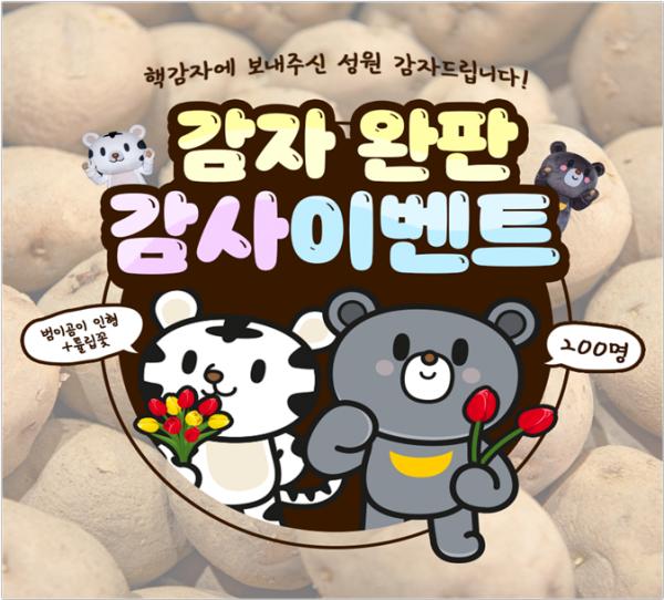 도 관계자는 “이번 강원 감자 팔아주기에 성원을 보내주신 모든 분들께 감사드리며 작게나마 보답 하고자 이벤트를 준비하였으니 많은 참여를 부탁드린다”고 말했다.