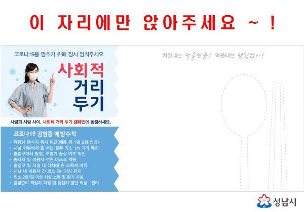 “이 자리에만 앉아주세요”를 구호로 한 사회적 거리 두기 세팅지는 성남시 로고 코로나19 감염증 예방수칙을 적은 문구로 디자인했다.