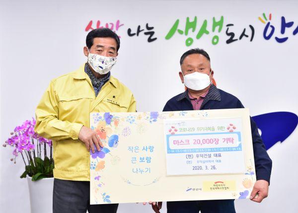 안산시는 ㈜우덕건설로부터 덴탈마스크 2만개를 기탁 받아 코로나바이러스감염증-19 예방을 위해 관내 65세 이상 어르신들에게 전달한다고 27일 밝혔다.