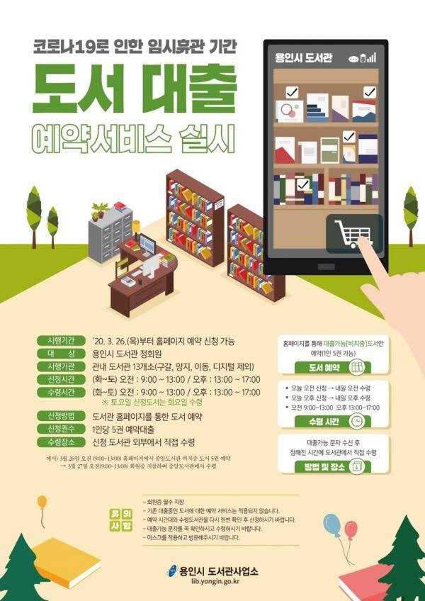 용인시는 27일 시민들이 안심하고 책을 빌려보도록 도서관 임시 휴관기간 예약 대출제를 시행한다고 밝혔다.