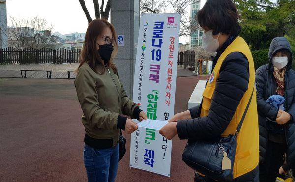 동해시자원봉사센터가 지난 25일 천곡동 일대에서 착한 마스크 나눔 자원봉사 캠페인과 지역사랑 5% UP 캠페인을 실시했다.
