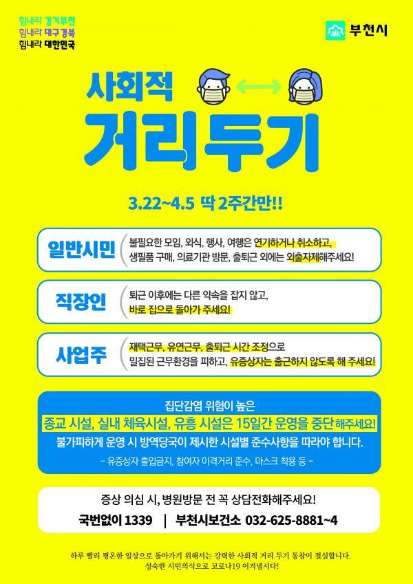 부천시는 집단 감염의 위험을 최소화하기 위해 3월 22일부터 4월 5일까지 2주간 사회적 거리두기 캠페인을 진행하고 있다.