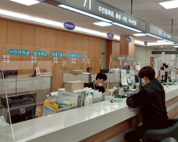 덕풍1동 행정복지센터는 코로나19 예방을 위해 민원창구에 투명가림막을 설치하고 코로나19 극복을 위한 다양한 응원문구를 부착했다고 26일 밝혔다.