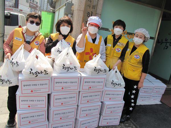 조리된 반찬과 함께 대한적십자사 중부봉사관에서 전달된 반 조리상태 미역국, 육개장 등과 보건용 마스크10매씩을 결연세대 110가구에 배달했다.