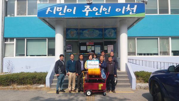 서이천로타리클럽은 지난 25일 코로나 19 지역 확산 방지를 위해 사용해 달라며 엔진밀차형 소독용고압분무기를 마장면에 기탁했다.