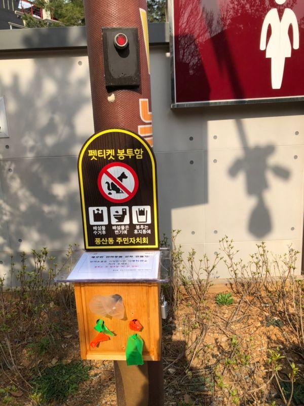풍산동 마을관리소 관계자는 “펫티켓을 지키는 마을문화 만들기와 더불어 주민 간 공동체 의식을 쌓아가자는 의미로 배변봉투함을 만들게 됐다”고 설치 배경을 설명하며 “영유아와 집을 나설 때 항상 기저귀를 준비하는 엄마처럼, 반려동물 배변봉투도 산책 시 반드시 챙겨야 할 필수 아이템이 되어야할 것”이라고 덧붙였다.