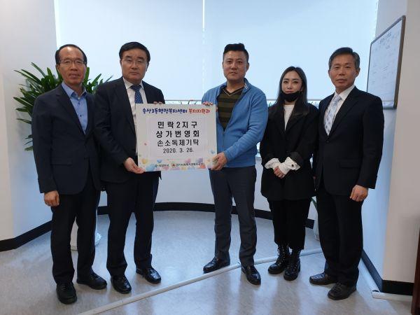 민락2지구 상가번영회는 지난 26일 송산3동 행정복지센터 복지지원과를 방문해 코로나19 감염에 취약한 분들을 위해 써달라며 손소독제 50여 개를 기탁했다.