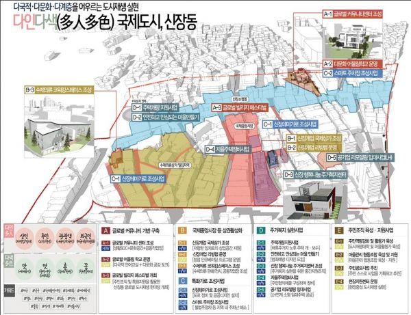‘다국적·다문화·다계층을 어우르는 도시재생’을 비전으로 제시한 ‘다인다색 국제도시, 신장동’뉴딜사업은 미군부대와 함께 형성된 문화 및 지역적 특성을 최대한 활용한 전략으로 청년과 가족문화 중심도시로 변화를 도모한다.
