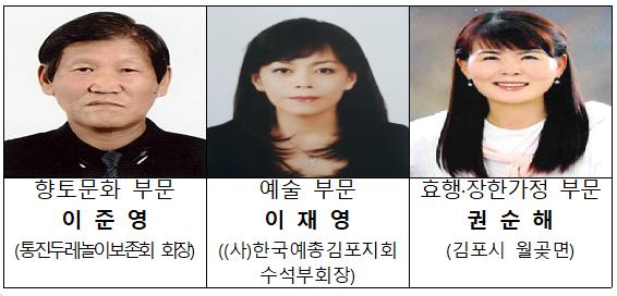 향토문화 부문 수상자인 이준영 님은 경기도 무형문화재 제23호인 통진두레놀이의 보존과 계승에 이바지했고 예술 부문 수상자인 이재영 님은 김포문학제와 시 낭송 아카데미를 통해 문학의 대중화에 기여했으며 효행·장한가정 부문 수상자인 권순해 님은 20여 년간 지병을 앓고 계시는 시어머니를 정성껏 봉양해 지역사회에 모범을 보여 왔다.